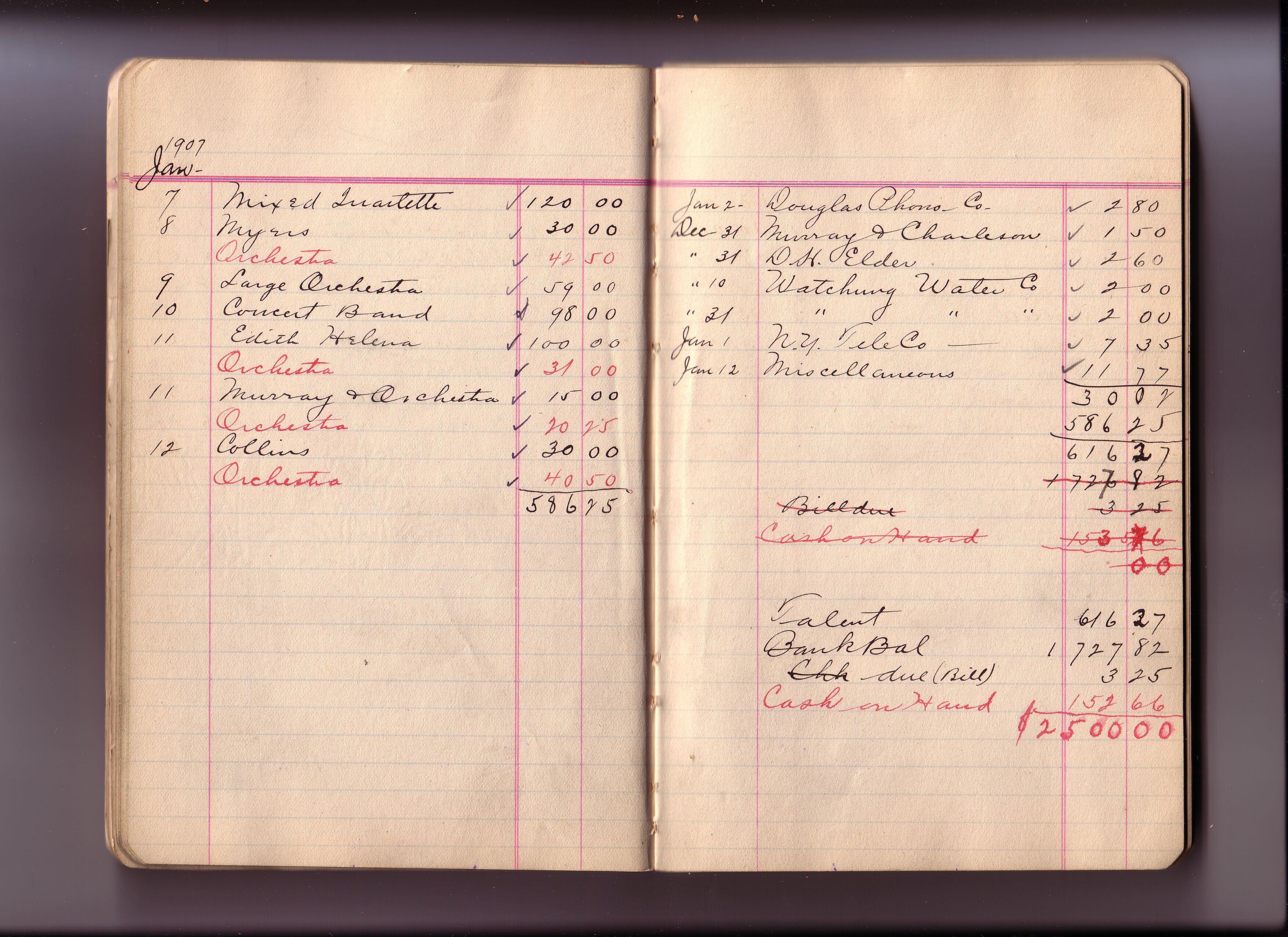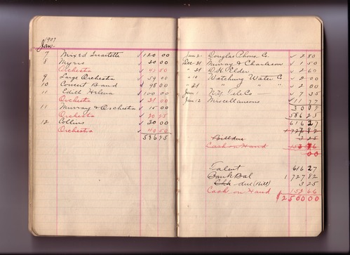 Thomas Edison's New York City Recording Studio Cash Book 03 (of 21), Image 30 (of 93). (Notebook #: PN-06-07-02, NPS catalog #: EDIS 1414), This book documents expenditures for recording artist fees and other payments authorized by studio manager Walter H. Miller from July 02, 1906 – February 08, 1908. Digitally scanned December 2004 through July 2005 at resolution 300 dpi, 24 bit.