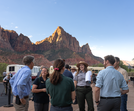 A crowd of people stand in front of the red, sandstone Watchman formation with several shuttle buses visible behind them.