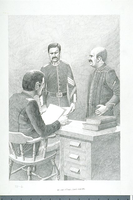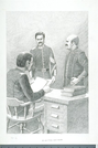 Interior scene of the surgeon's office in the Fort Union Hospital. Depicted are the surgeon, an assistant, and the First Sergeant.