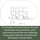 "To conclude our look at historic structure preservation documentation, we’re examining some of the new challenges facing preservationists and advanced techniques in preservation." The image is a schematic drawing of the upper level plan from the historic structure report for the Forks of the Road Bridge.