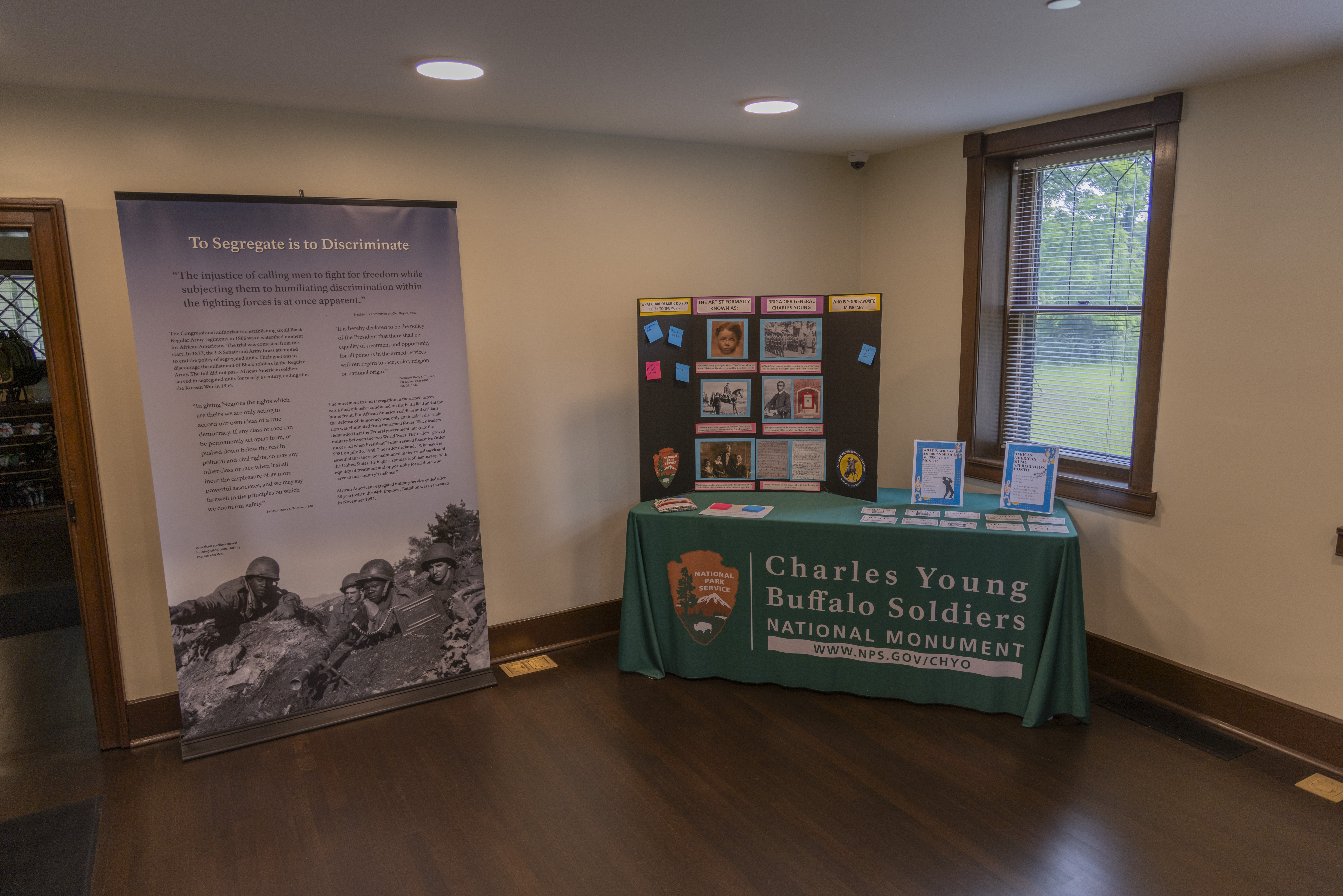 A light blue-colored pull-up banner with text and photos on them next to a table with a dark green tablecloth with printed text that reads Charles Young Buffalo Soldiers National Monument and NPS arrowhead to the left of the text, inside of a room in the Young family home.