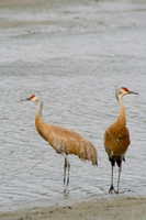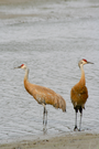 Two sandhill cranes, with the distinctive red patches on their heads, stand along the water's edge on the Lake Clark coast
