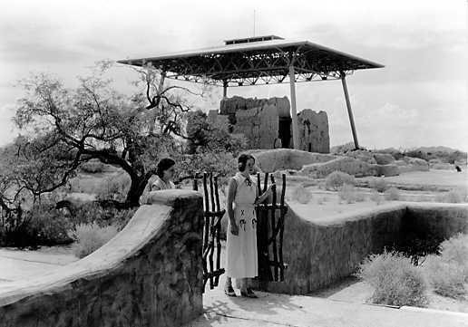 The wall and gate at the south side of the Administration Building patio at Casa Grande Ruins National Monument, showing the main building of Casa Grande Ruins in the background. Nancy Pinkley (Frank "Boss" Pinkley's daughter) is in gateway, followed by Custodian Hilding Palmer's wife.