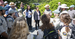 Woman in a black jacket is surrounded by a dozen people in uniform along a gravel pathway fringed with dense shrubbery.