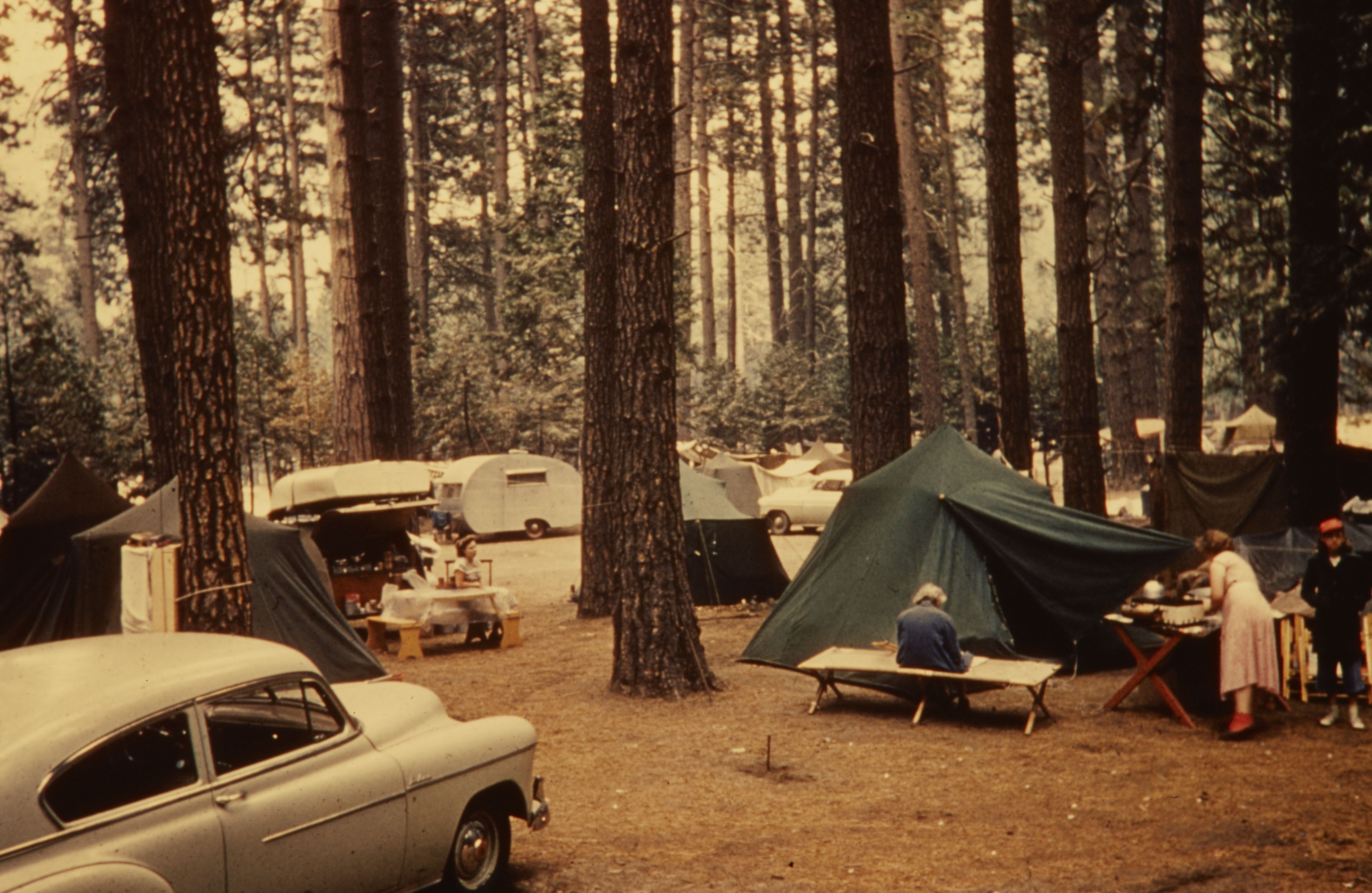 Visitors in the campground near tents and cars. Image Number 76-433-22.