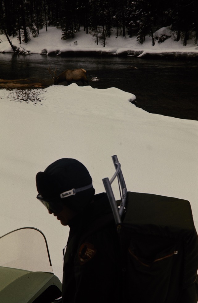 NPS employee with a moose in the distance in the river in Yellowstone National Park.