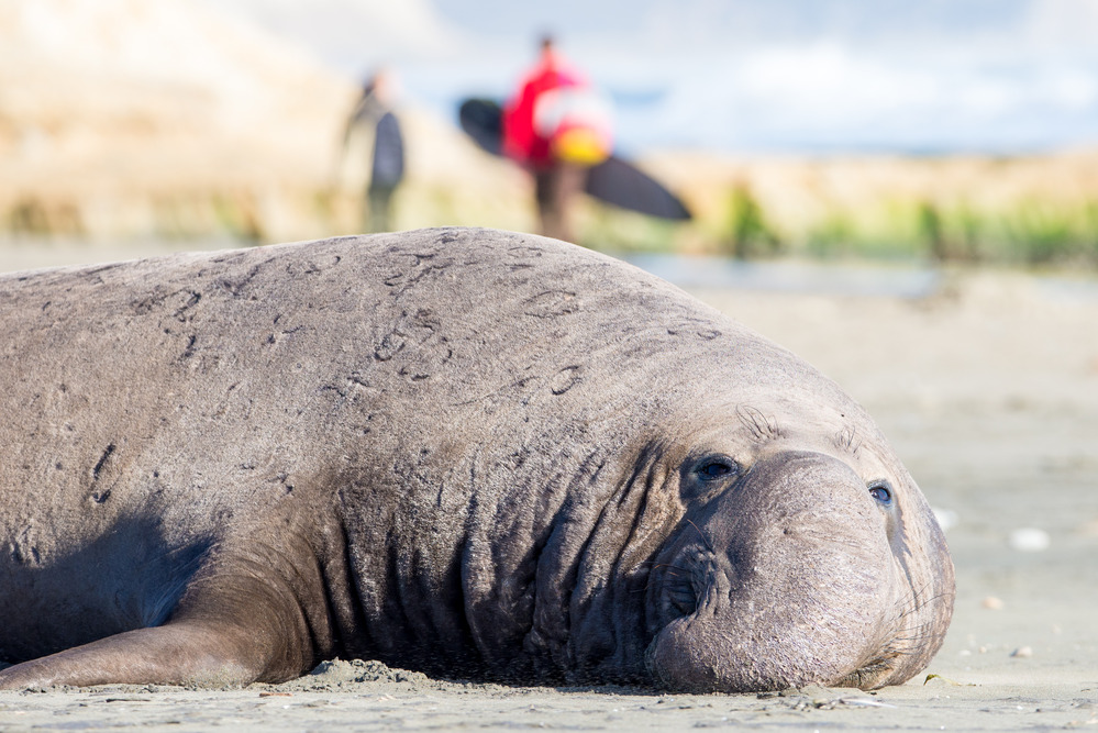 Male northern elephant seal resting on Drakes Beach as surfers walk by in the distance.