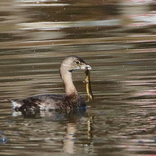 A two tone brown pie-billed grebe eating a frog. Photo credit: Keith Watson
