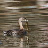 A pie-billed grebe colored brown in a lake eating a frog. Photo credit: Keith Watson