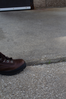 A brown boot positioned along a linear step up between two areas of concrete; the step is about as high as the black sole of the boot.