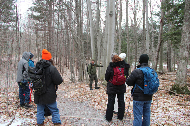 A ranger in uniform stands next to a tree while a group of people in winter clothing appear to be listening.