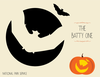 Template to use to carve a jack o' lantern. Image features a bat against a full moon and smaller bat nearby. There is also an example of the image used on a jack o' lantern. Text reads "The Batty One".