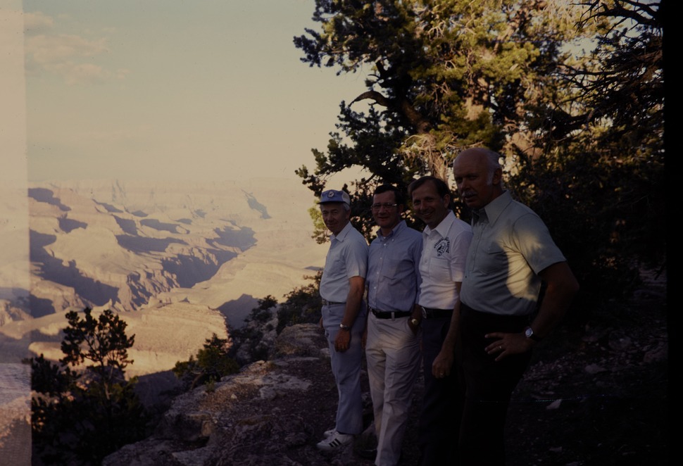 NPS Director William Whalen's Colorado River float trip in Grand Canyon National Park. Left to right Stitt, Whalen, Curry, and Chapman at Shoshone Point.