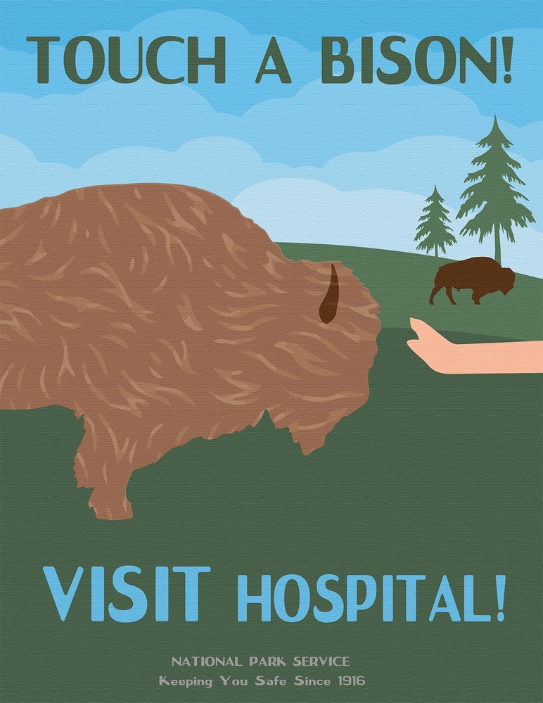 Infographic with text reading "Touch a Bison, Visit a Hospital! National Park Service. Keeping You Safe Since 1916." Illustration is of a hand reaching out to touch a bison in a field with another bison and a couple of trees in the background.