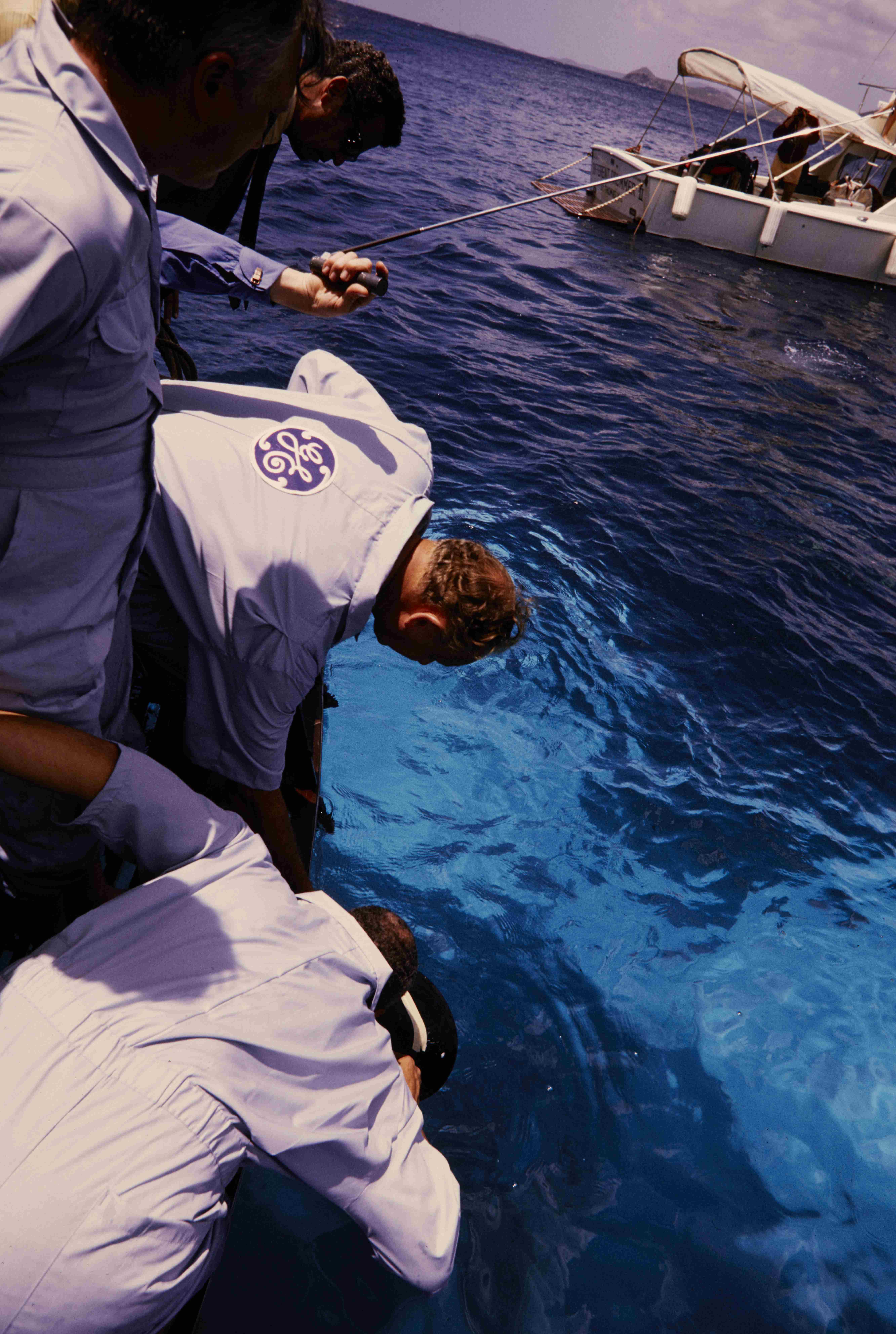 Men wearing GE jumpsuits looking into the water during the Tektite II Project in Virgin Islands National Park.