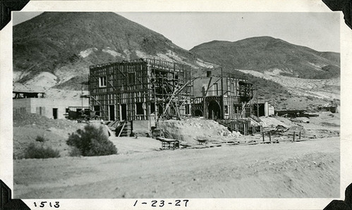 Scotty's Castle Main House, looking northeast. Commissary - the future Annex - on left in back ground. January 23, 1927. Photographed by Mat Roy Thompson.