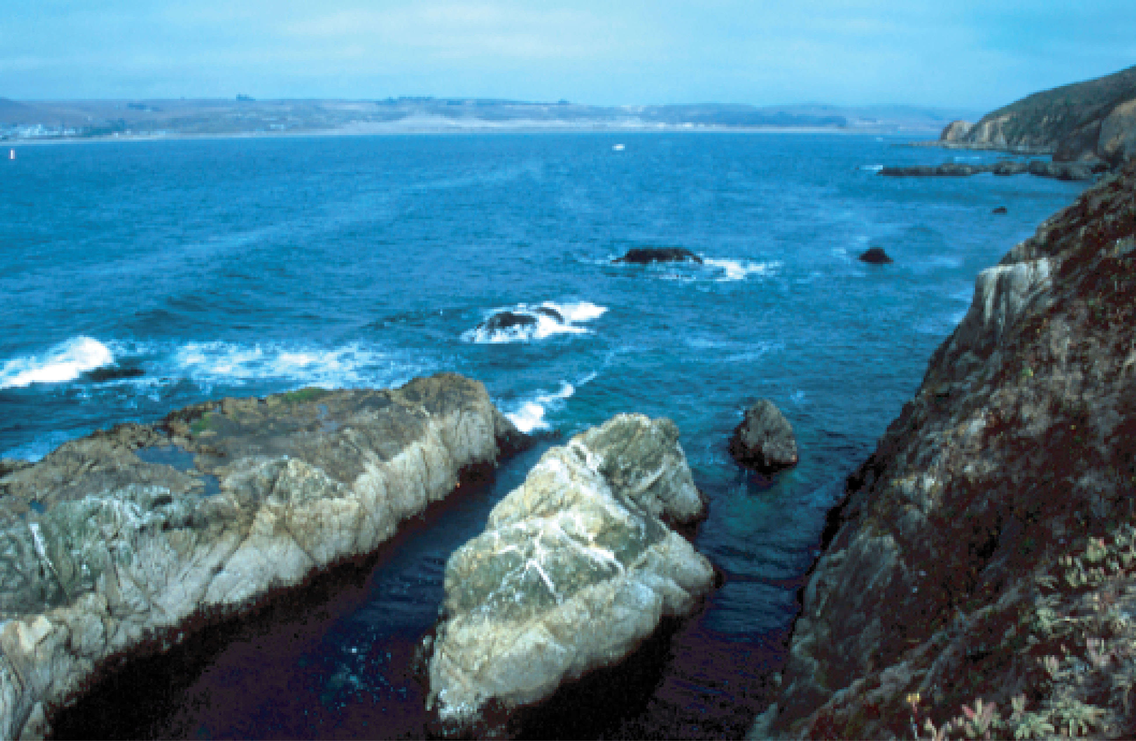 Point Reyes National Seashore, California. Tomales Bay is the surface expression of the San Andreas Fault. The granite rocks in the foreground are similar to those found in Yosemite National Park in the Sierra Nevada Mountains. They have been transported about 300 miles (500 kilometers) in a north-northwestward direction along the transform plate boundary. The sedimentary and metamorphic rocks across the fault line are similar to those found in Redwood National and State Parks on the North Coast of California. They were lifted out of the ocean as part of the accretionary wedge of an ancient subduction zone.