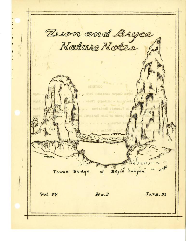Zion-Bryce Nature Notes, Vol. 4, No. 3, June, 1932. Articles include: tower bridge, elk formerly in Paria Valley, commons birds of Zion.