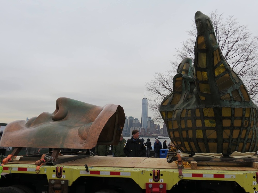 Statue of Liberty National Monument: The original torch and a full-size original model of Lady Liberty's face are loaded onto a vehicle to be moved to the new Statue of Liberty Museum. One World Trade Center is in the background.