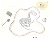 A color pencil drawing of a fossil excavation site with tools and a full dinosaur skeleton.