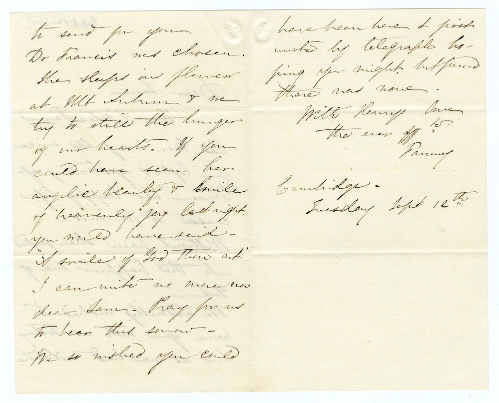 She sleeps in flowers at Mt Auburn & we try to still the hunger of our hearts. If you could have seen her angelic beauty & smile of heavenly joy last night you would have said – “A smile of God thou art.” I can write no more now dear Sam. Pray for us to bear this sorrow – We so wished you could [p. 3] have been here & first wrote by telegraph hoping you might, but found there was none.