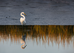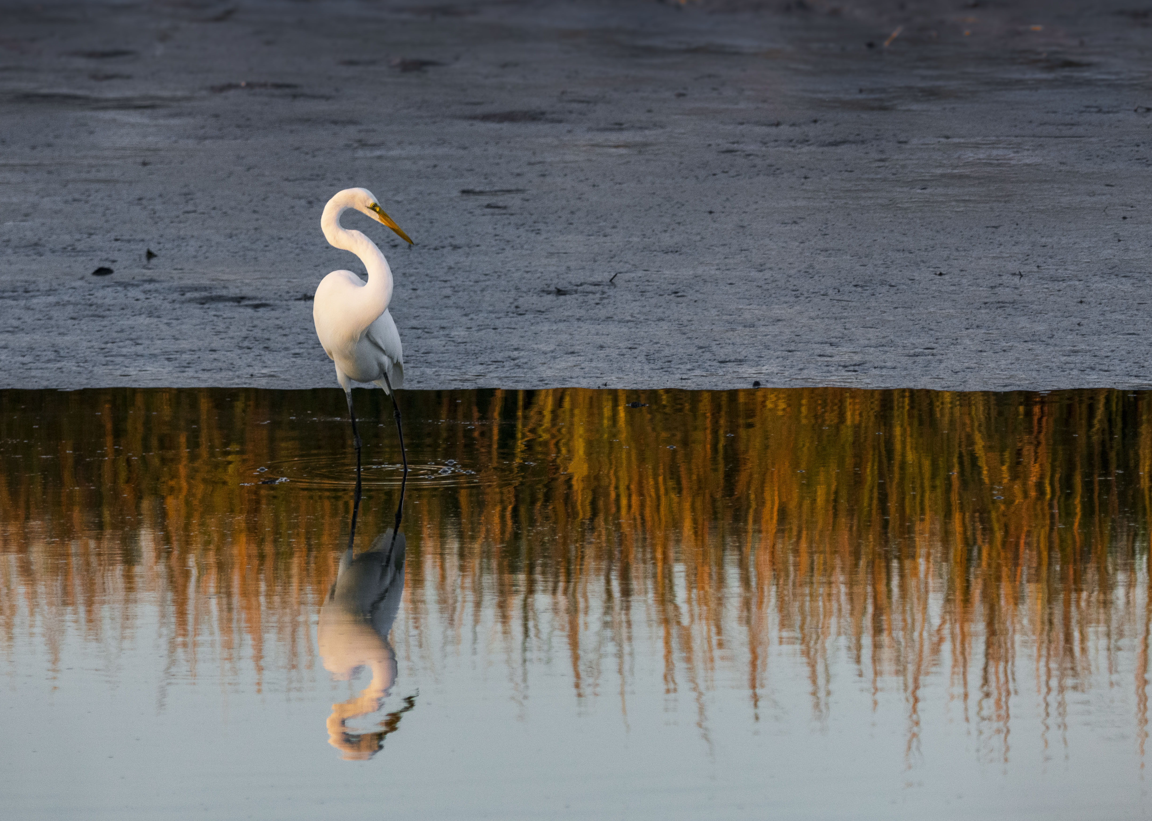 A Great Egret wading in the mudflats of Forsyth National Wildlife Refuge. Tall grasses behind the egret are reflected by the still shallows of the salt marsh and glow ochre in the setting sun.