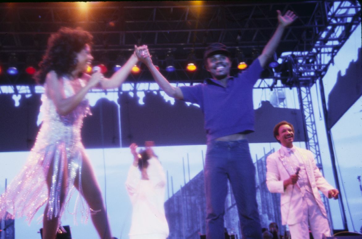 Marilyn McCoo performing with a man on stage. ; July 1987