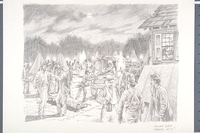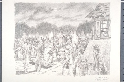 Rows of Sibley tents are shown, with litter-bearers carrying the wounded to and from horse-drawn ambulance wagons. Other wounded soldiers who have already been treated are shown milling about. In the background, to the right, is a portion of the Noah Cantrell House with light coming through a window from a makeshift operating room. Established and organized by Asst. Surgeon Bernard J.D. Irwin, Union and Confederate soldiers alike were given medical treatment in this first consolidated tent hospital, a forerunner of modern military field hospitals.