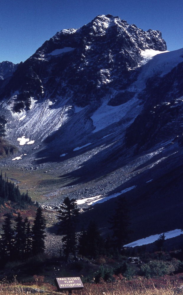 A rocky basin of snow and rock. In the distance is a blunted peak and in the foreground is a forested area with a dirt clearing. In the extreme foreground is a sign that reads "trail closed, plant restoration."