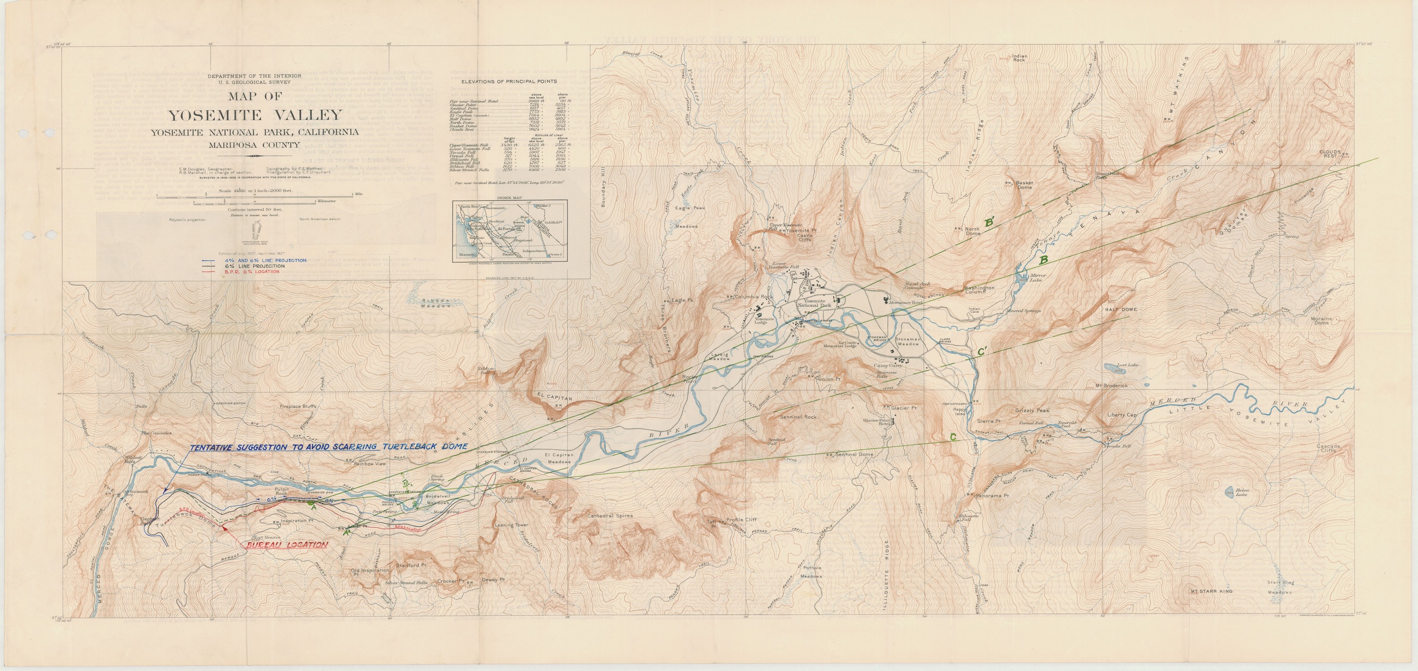 Inside of brochure with map of Yosemite Valley and annotations related to Turtleback Dome