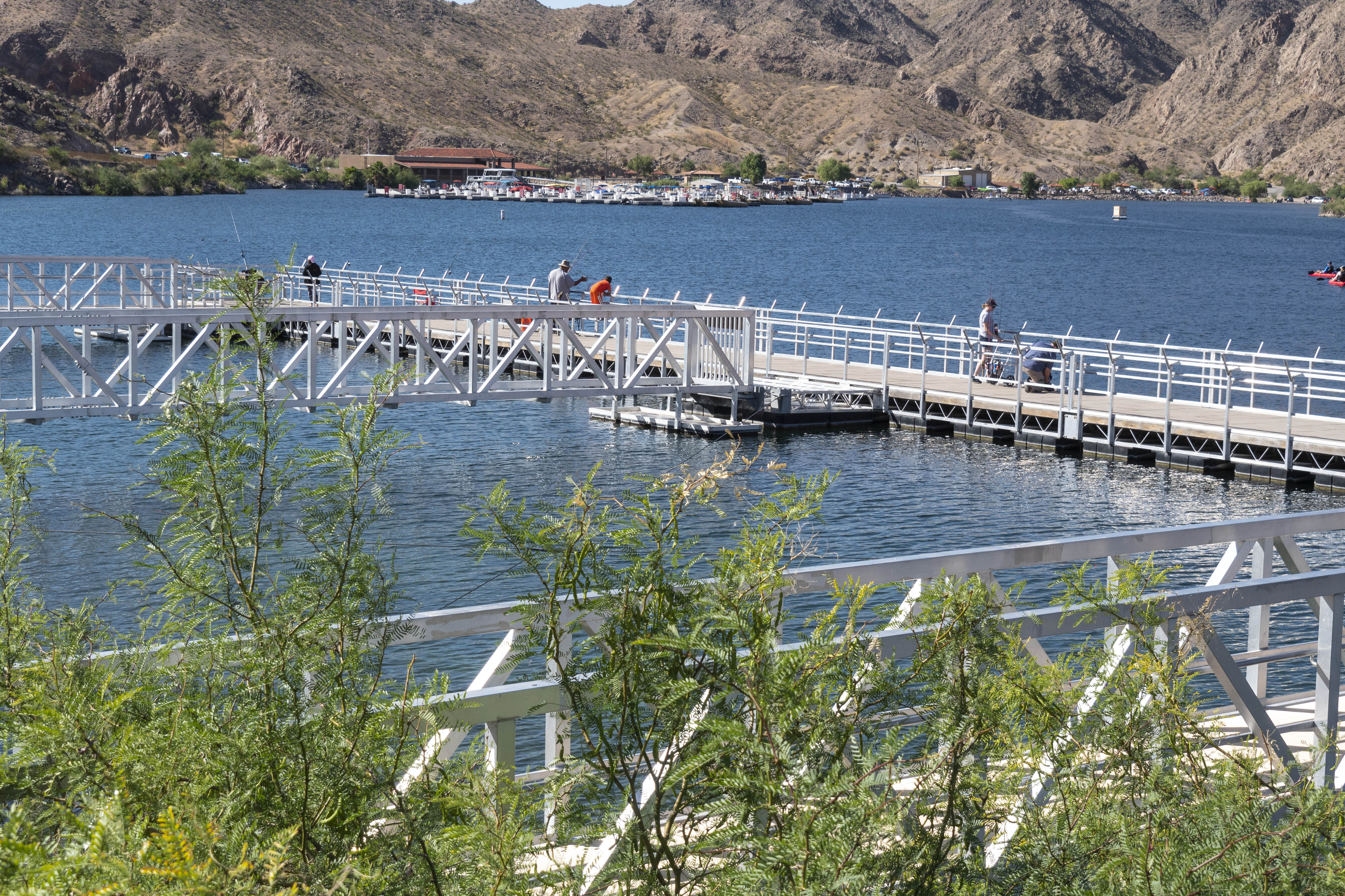 Mesquite trees in foreground, large metal fishing pier in body of water mid-ground, marina and desert hills in distance