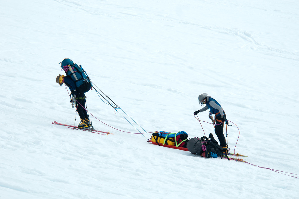 two mountaineers tethered together, pulling sleds up a glacier