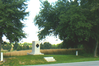 Several steps lead to a white, rectangular monument at the edge of a field, framed by leafy trees.