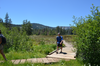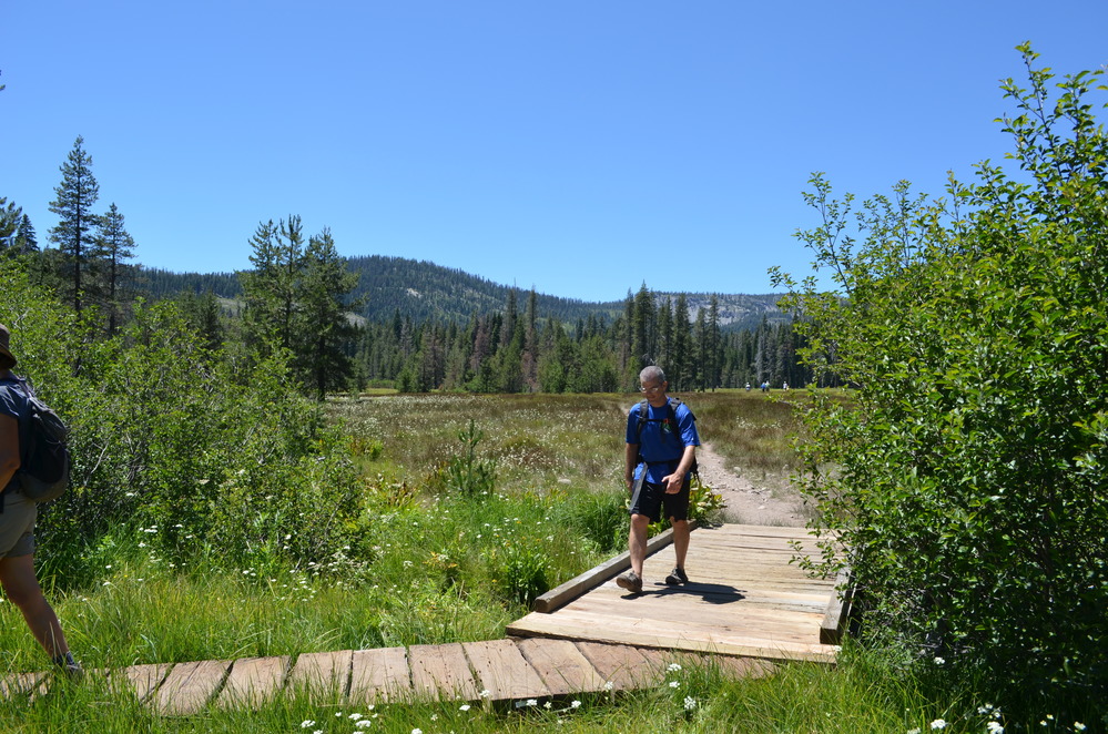 Hikers on a wooden boardwalk in a meadow near the Devils Kitchen Trail.