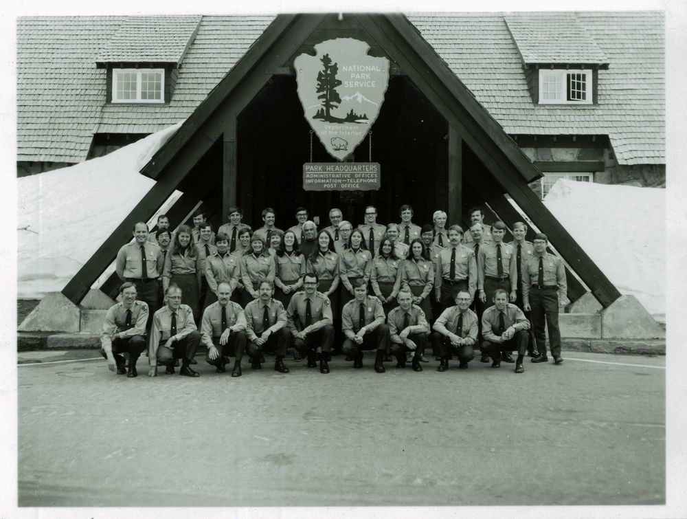 Subject: Entire Park Staff 1974 Location: Park Headquarters Date: Summer of 1974 Handwritten on back of photographic file card: Front Row from Right to Left J. Holcomb, H. Snow, D. McGrath, L. Smith, D. Melton, T. McDonough, D. Stahl, D. Larson, C. Rush Middle Row: (second row moving up) H. Henderly, Larry Smith, G. Hoskins, A. Galperin, E. Hernandez, R. Edwardds, P. Sustesson, M. Gorski, N. Affolter, P. Eggen, C. DeMartini, B. Wilson. 3rd Row up J. Reymann, R, van Noord, F. Matsuura, seasonal from Lava Beds, R. Beltran, S. Poirer, Elva Michaels, S. Goldberg, S. Nelson, S. Toyama, Top Row: V. Affolter, S. Page, J.Henke, N. Siler, J. Lahey, P. Rose, J. White, G. Mason, D. Panebaker, J. Wiggins