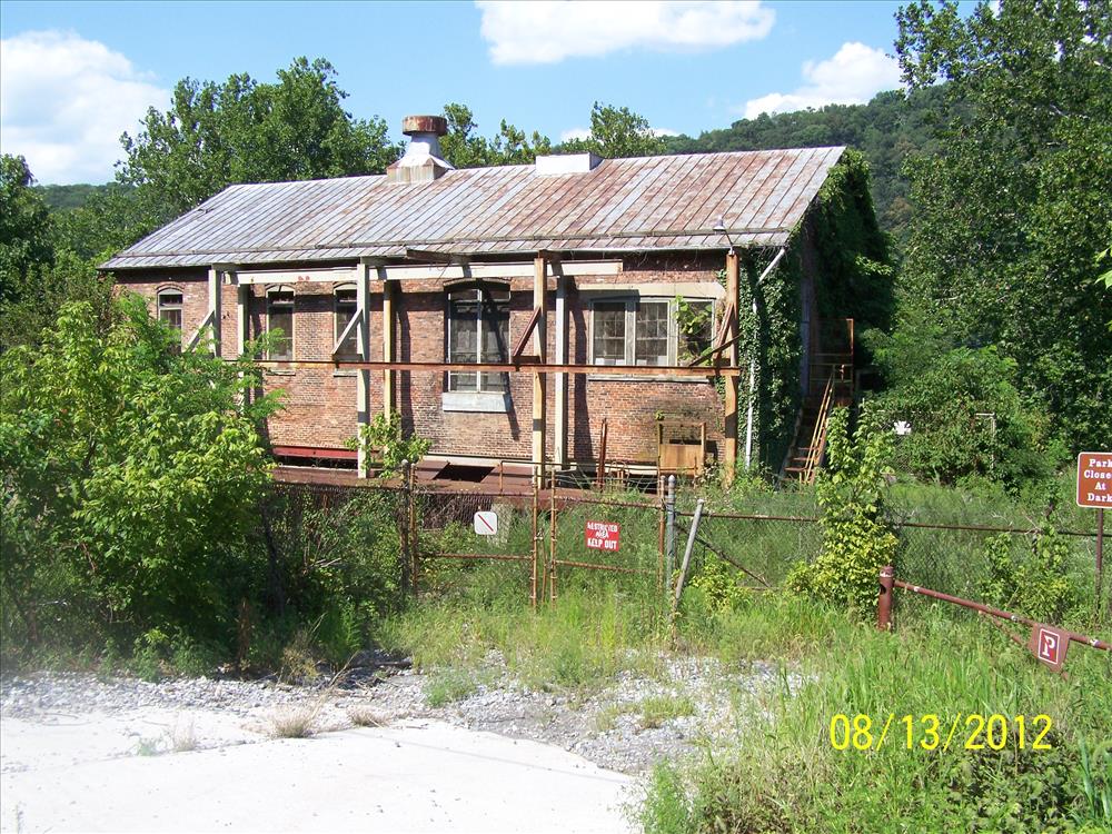 The photograph views of the historic Hydroelectric Plant building on August 13, 2012, show the deteriorating exterior conditions - i.e. vegetation overgrowth, rusting chain link fence, rusting sheet metal roof, broken windows, paint failures, and water intrusions - which justify the project stabilzation work; Harpers Ferry National Historical Park/NPS. This building is located in Lower Town, at the east end of hte historic Potomac Canal, along the Potomac River.