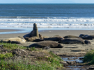 Large elephant seal with a big proboscis rears his head back, vocalizing as two females also vocalize and all the other seals on the beach appear to be snoozing.