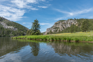 The Missouri River winds around a meadow with wildlfowers and conifers. White cliffs in the distance.