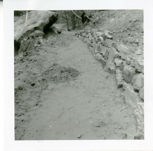 NPS personnel working on the trail maintenance of the Narrows. ; ZION Museum and Archives Image 008.03.02-6of7 ; ZION 15933