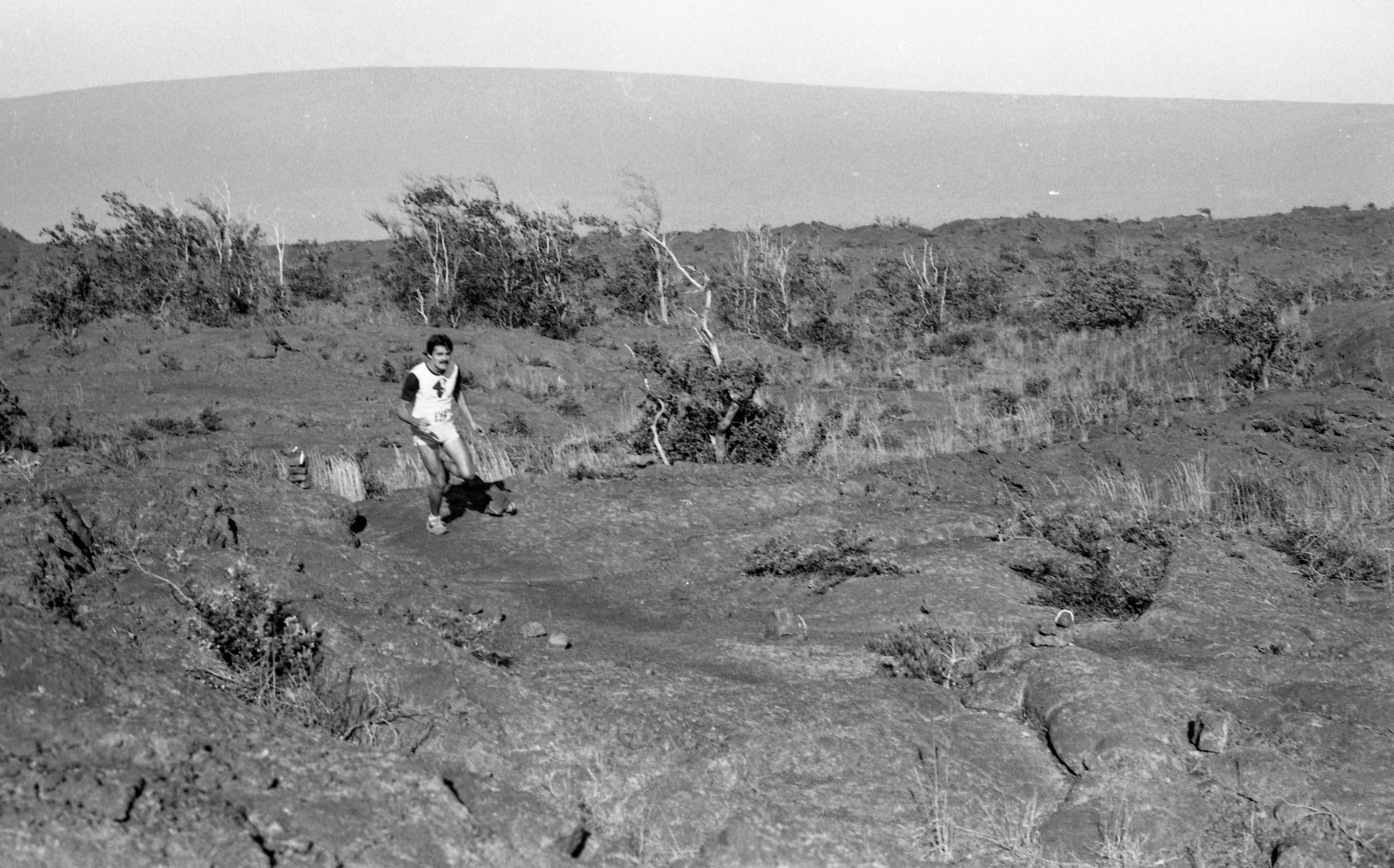 A black and white image of a man running across a lava field. He is located towards the center left of the image, running up a short incline. He is in mid run with his arms slightly bent at the elbow and his left foot raised. The man is wearing a t-shirt with dark colored sleeves and a light-colored body. There is a smiley face graphic wearing a cape printed on the front of his shirt. Affixed to his shirt is a race bib. The bib reads, "Kīlauea Summit Wilderness Marathon 125." He is also wearing running shorts and sneakers and has a moustache. He is running across a baren lava covered landscape with a few small ‘ōhi‘a trees and grass growing in between the cracks of the lava. In the background, Mauna Loa is visible.