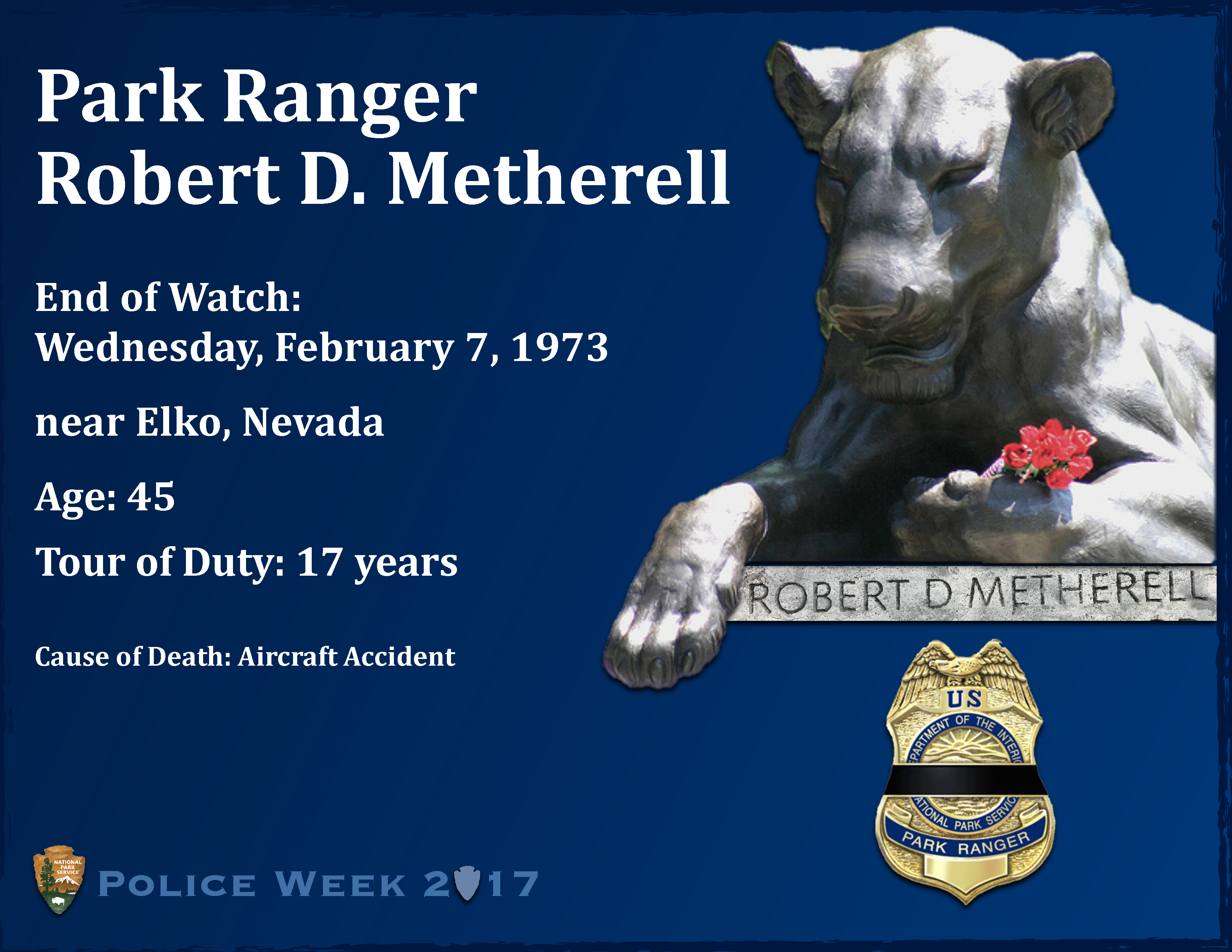 US Park Ranger Robert D. Metherell was killed in the line of duty on February 7 1973.