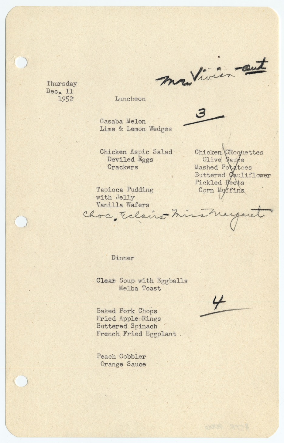 Menus for the Truman's time in the White House from November 1952 to January 1953. There are 81 menus in total. Menus consist of lunch and dinner everyday, including special meals like Cabinet dinners, Thanksgiving, and Christmas meals. Some of the meals have edits made in pencil or notes about how many people and who is going to be gone for the meal.