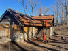 The same building as described previously, seen from the rear right, with new wood shingles nearly covering the roof. Foot Boards are attached to the roof and an orange ladder leans against the side of the building. Cloudless blue sky is visible in the background beyond the roof.