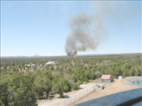 Full fire with black smoke advancing on buildings on the first day of Long Mesa Fire, Mesa Verde National Park, July 29, 2002
