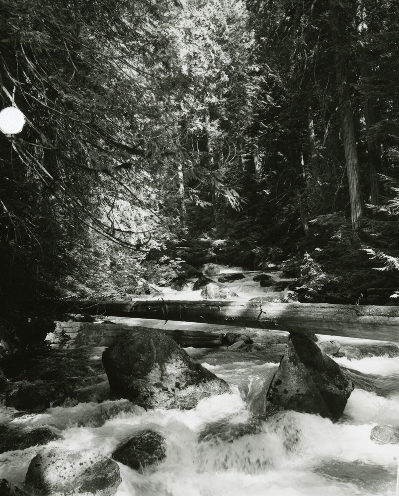 Stand of mostly Western red cedar (Thuja plicata) along an unidentified creek. (North Cascades NPS Complex Museum Collection, NOCA.0002 Assembled Collections, Series V: 1963 NPS North Cascades Survey Photographs, Subseries A: Prints and Negatives, File 292a)
