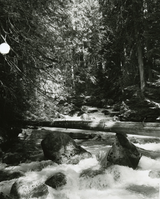 A rushing creek in a forest. A fallen log spans the creek.