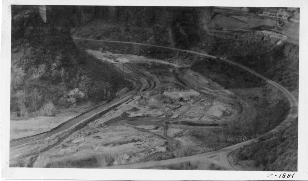 B&W PHOTOGRAPH OF WORK IN THE RIVER BED WEST OF THE WEEPING ROCK. ORIGINAL CATALOGER: WOOD, ROBERT J. 10DEC1986. **NOTE: LOCATION OF PHOTO IS ACTUALLY AT BIG BEND DURING A CHANNILIZATION PROJECT. 11/22/2004 NEGATIVE LOCATED 18/23/2006: ZION 603/01_06