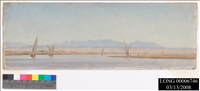 OIL ON PREPARED BOARD. RIVER IN FOREGROUND, DOTTED W/ NUMEROUS SAILBOATS; SHORELINE AT RIGHT, LEFT, AND IN DISTANCE. MIDDLE HORIZON LINE; BLUE UNCLOUDED SKY. WIDE RAGBOARD MAT COVERED W/ OFF-WHITE SILK. NO FRAME.