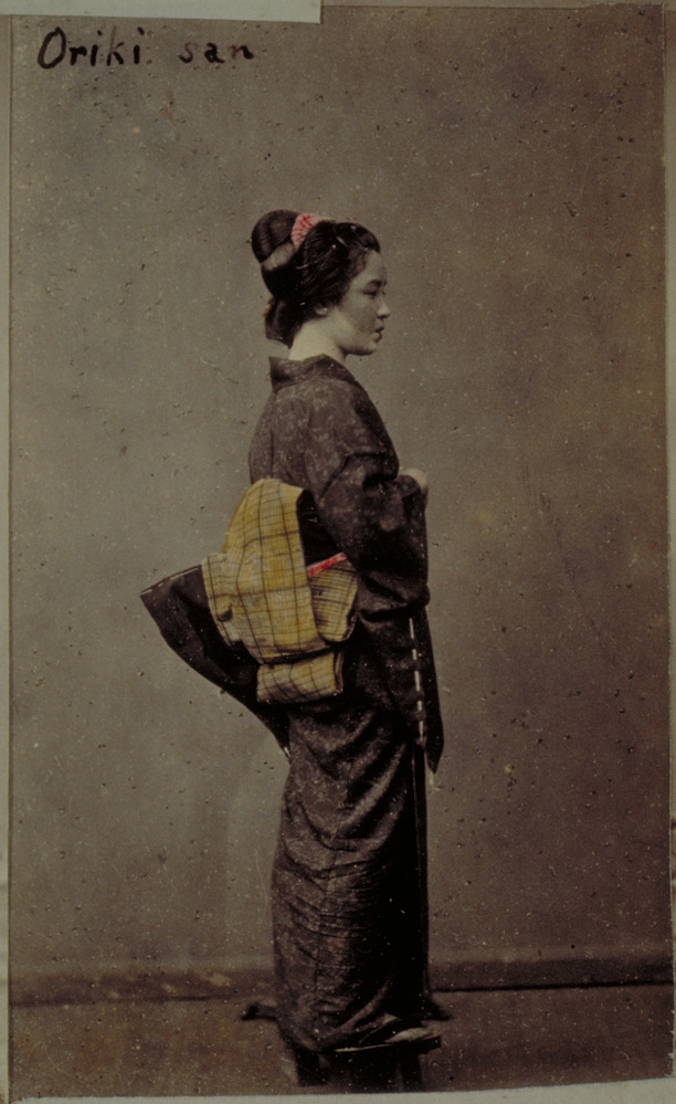 A Japanese woman, Oriki, stands against a plain backdrop. She wears an all-over patterned kimono, a checked obi [sash] and geta [wooden sandals] without tabi. Portions of her obi and hair ornaments have been hand tinted in shades of red and yellow. Much of her face has a grayish tinge. The wooden stand to keep her in place for the photo can be seen next to her feet. | Inscription: "Oriki san" in ink in block letters by Charles Longfellow. (On image.)