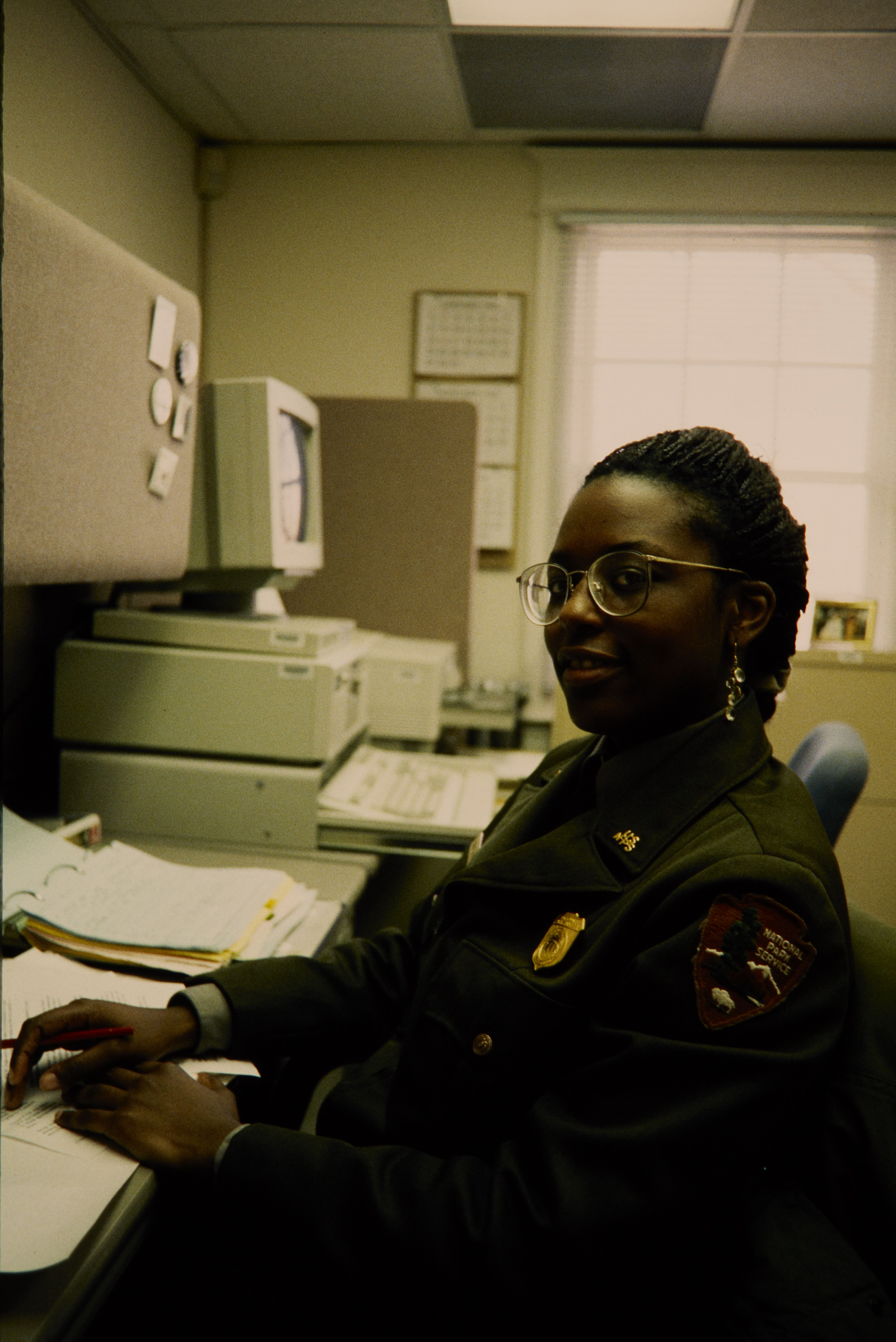 NPS employee sitting at her desk at Frederick Douglass National Historic Site.